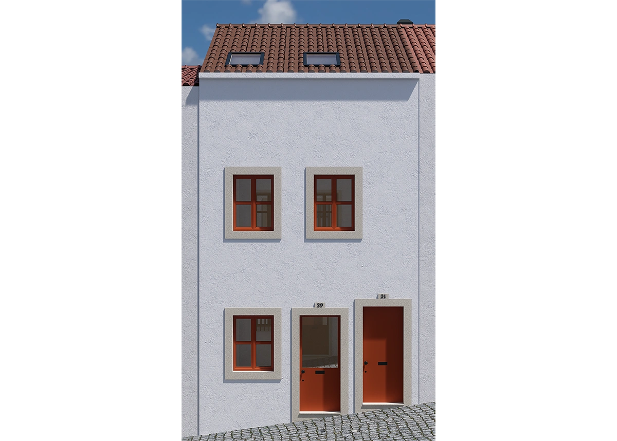 A escolha do vermelho nas caixilharias marca o gesto mais expressivo do projeto, conferindo-lhe um traço de personalidade vincado. Este detalhe, cuidadosamente ponderado, permite que a casa se destaque na malha urbana, sem nunca a violentar. É uma afirmação contida, quase um sussurro cromático, que equilibra tradição e ousadia.